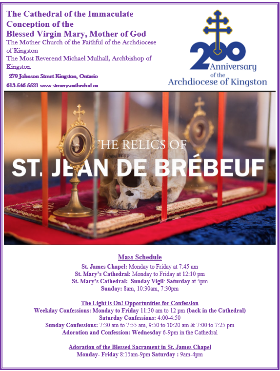 • Following Mass to 4 PM – Veneration of the major relic of St. Jean de Brébeuf and his companion martyrs.